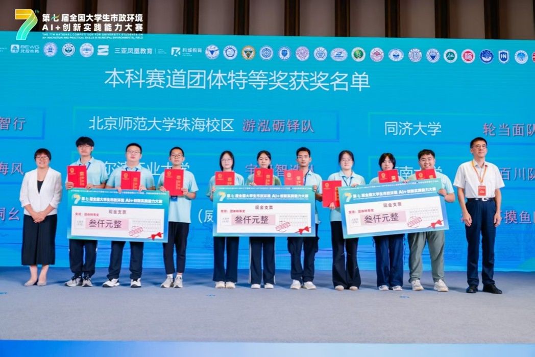 2025 年 9 月 20 日至 21 日,第七届全国老员工市政环境 AI + 创新实践能力大赛决赛在三亚市顺利举行。本届大赛由哈尔滨工业大学、同济大学、上海城投污水处理有限公司、三亚发展控股有限公司及北控水务集团有限公司联合主办,在规模上创下历届之最——共覆盖全国 179 所高校,吸引 671 支队伍参赛,汇聚了哈尔滨工业大学、同济大学、北京师范大学、天津大学、中山大学等国内顶尖院校,参赛阵容与竞争激烈程度均远超以往。在这场高规格的全国性赛事中,公司本科生团队凭借扎实的专业能力与创新实践成果,最终在全国决赛中斩获 “团体特等奖”。