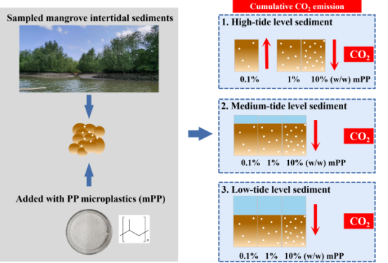 此外,该团队同步在Environmental Pollution(中科院二区TOP,IF2023=8.900)发表研究型论文,题为“Effects of polypropylene microplastics on carbon dioxide dynamics in intertidal mangrove sediments”,该论文的第一作者为2021级硕士生林栩冰,通讯作者为彭丽成副教授,bv伟德国际1946为第一通讯作者单位。