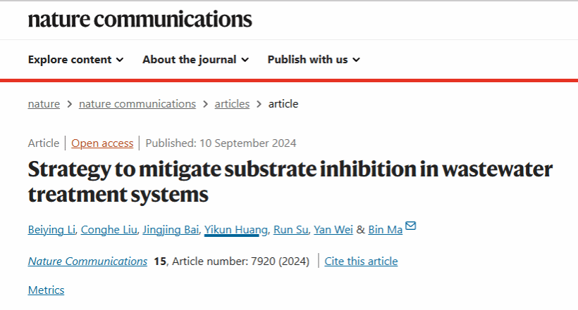 2024年9月10日,高水平学术期刊《Nature Communications》刊发了伟德国际victor1946马斌研究员团队的研究成果“Strategy to mitigate substrate inhibition in wastewater treatment systems”。bv伟德国际1946博士生李倍莹为该文唯一第一作者,马斌研究员为独立通讯作者。