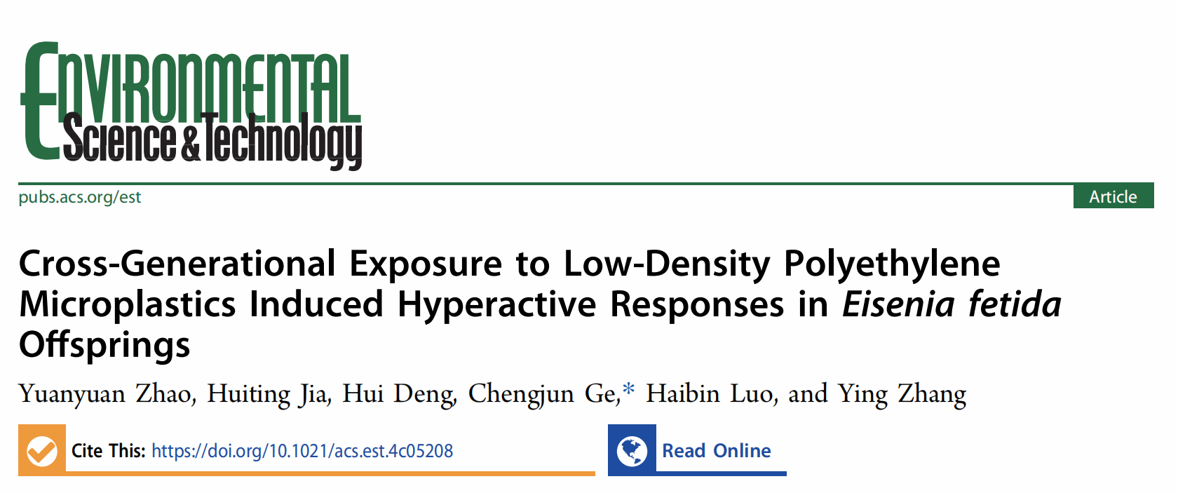 2024年11月17日,环境领域权威期刊《Environmental Science & Technology》在线发表了伟德国际victor1946葛成军教授团队的副封面文章“Cross-Generational Exposure to Low-Density Polyethylene Microplastics Induced Hyperactive Responses in Eisenia fetida Offsprings”。bv伟德国际1946博士后赵媛媛为该文唯一第一作者,葛成军教授为独立通讯作者。