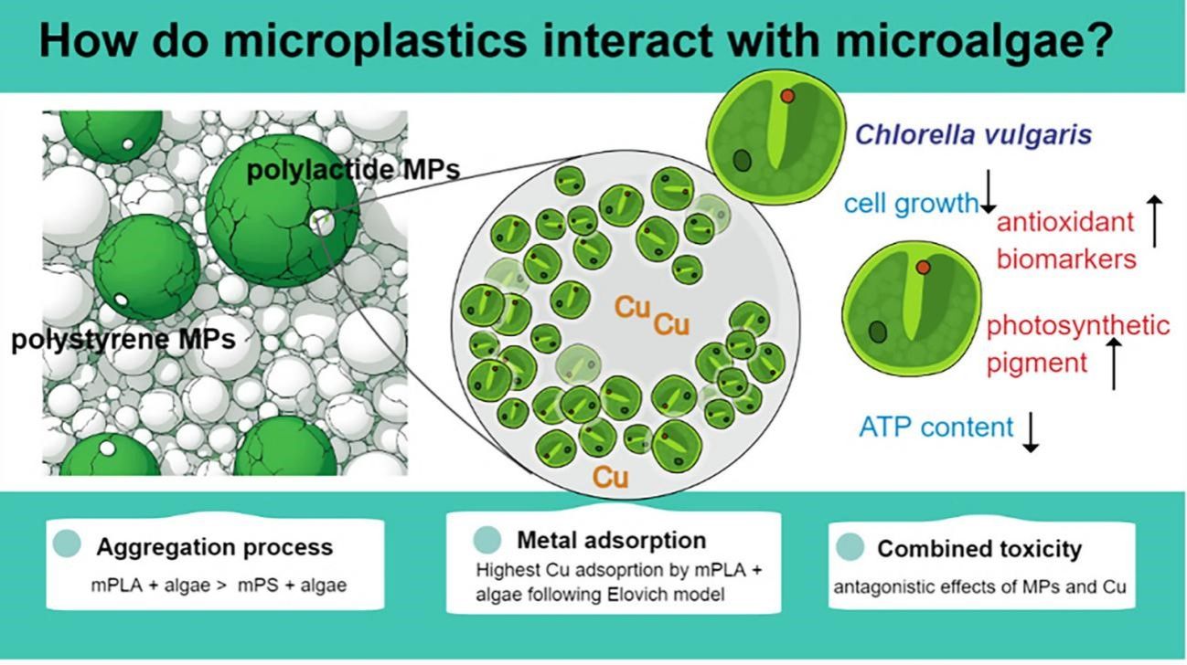 微塑料(MPs)通常与水环境中的微藻共存,在其相互作用过程中会引起MPs与微藻的异质聚集,并可能影响MPs在水生环境中的迁移。此外,异质聚集可能通过MPs吸附其他污染物而影响其他污染物的命运或改变其水生毒性。因此,本研究探讨了小球藻(Chlorella vulgaris)与两种类型的 MPs(mPS和mPLA)的异质聚集过程及其关键驱动机制。此外,我们通过比较微塑料-微藻聚集体与原始MPs对Cu(II)的吸附能力,评估异质聚集对 MPs老化的影响及其对微藻的毒性,分析了微塑料-微藻聚集体的环境影响。研究表明微藻定殖在MPs表面,其可能主要通过静电相互作用、孔洞填充、亲水相互作用和藻类-细菌共生作用形成。由于静电相互作用、配位、络合和离子交换,异质聚集导致微塑料-微藻聚集体比原始MPs更有效的复合Cu(II)。暴露于MPs(原始MPs或老化MPs)或Cu(II)抑制了小球藻的细胞生长,而综合生物标志物反应(IBR)显示与原始 MPs相比,老化MPs 对小球藻的抑制作用更明显,MPs和Cu(II) 共同暴露下对微藻具有拮抗作用,MPs会改变小球藻对Cu(II)的生物利用度。这些发现表明MPs和微藻的异质聚集可能会改变它们的环境归宿以及与其他污染物的复合毒性。