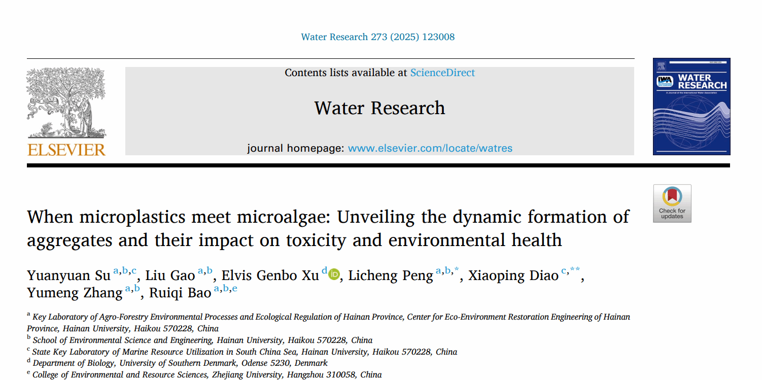 近日,环境领域权威期刊《Water Research》(中科院一区TOP,IF2023=11.5)刊发了伟德国际victor1946彭丽成副教授团队的最新研究成果“When Microplastics Meet Microalgae: Unveiling the Dynamic Formation of Aggregates and their Impact on Toxicity and Environmental Health”。该论文以bv伟德国际1946为第一通讯作者单位,bv伟德国际19462022级博士生苏园园为该文唯一第一作者,彭丽成副教授为第一通讯作者,刁晓平教授为共同通讯作者,论文合作者还有南丹麦大学的Elvis Genbo Xu教授等。
