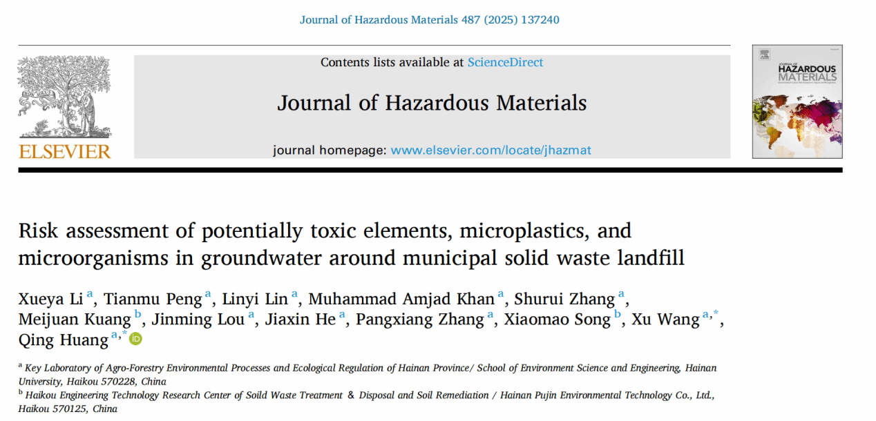 近日,环境领域权威期刊《Journal of Hazardous Materials》(中科院一区TOP,IF2024=12.2)刊发了伟德国际victor1946黄青研究员团队的最新研究成果“Risk assessment of potentially toxic elements, microplastics, and microorganisms in groundwater around municipal solid waste landfill”。该论文以bv伟德国际1946为第一通讯作者单位,bv伟德国际19462022级硕士研究生李学雅为该文唯一第一作者,黄青研究员为第一通讯作者,王旭副教授为共同通讯作者。